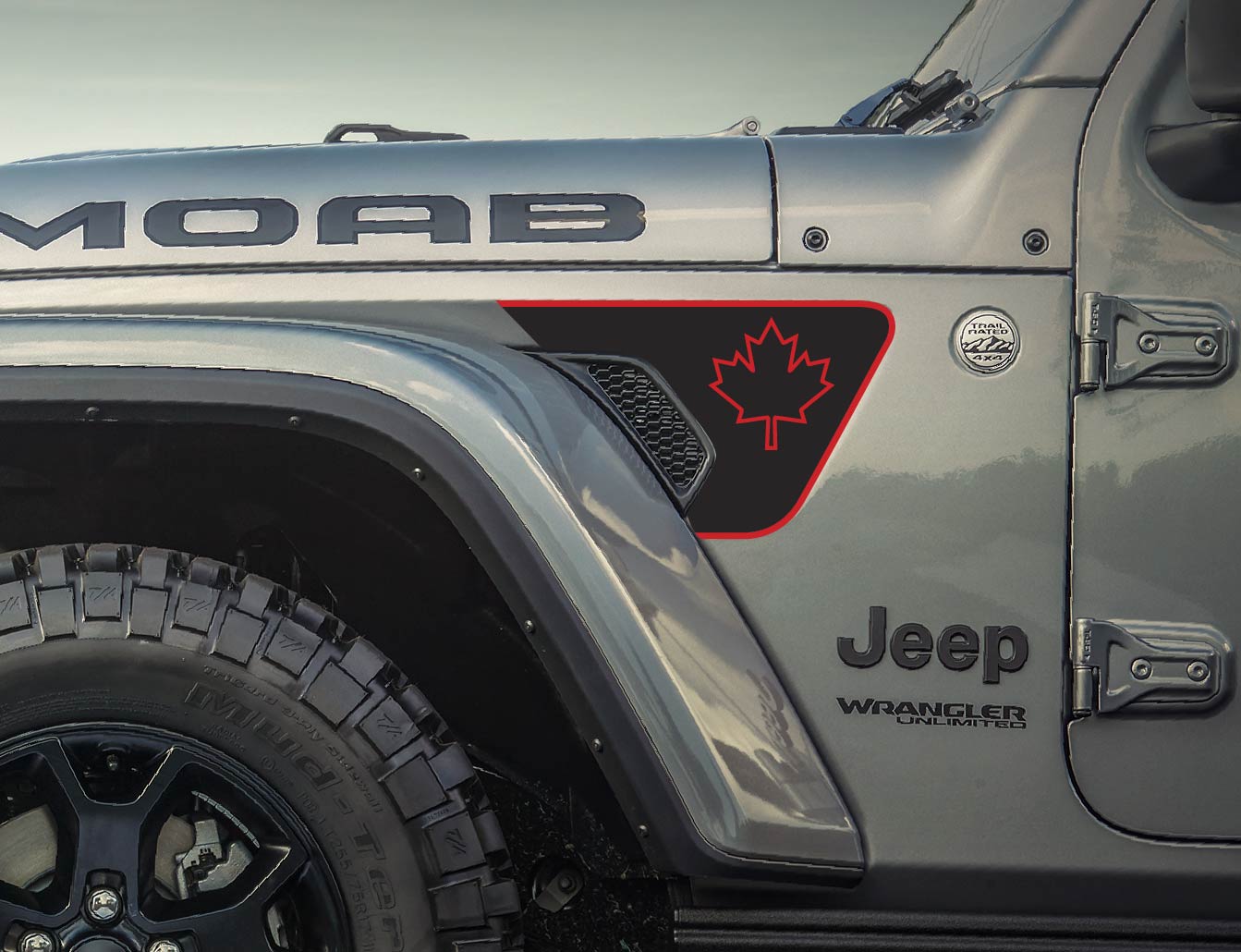 2 Layer Canadian Maple Leaf decal cut to fit inside the 2018 & newer Jeep Wrangler JL and 2020 and newer Jeep Gladiator fender vent.