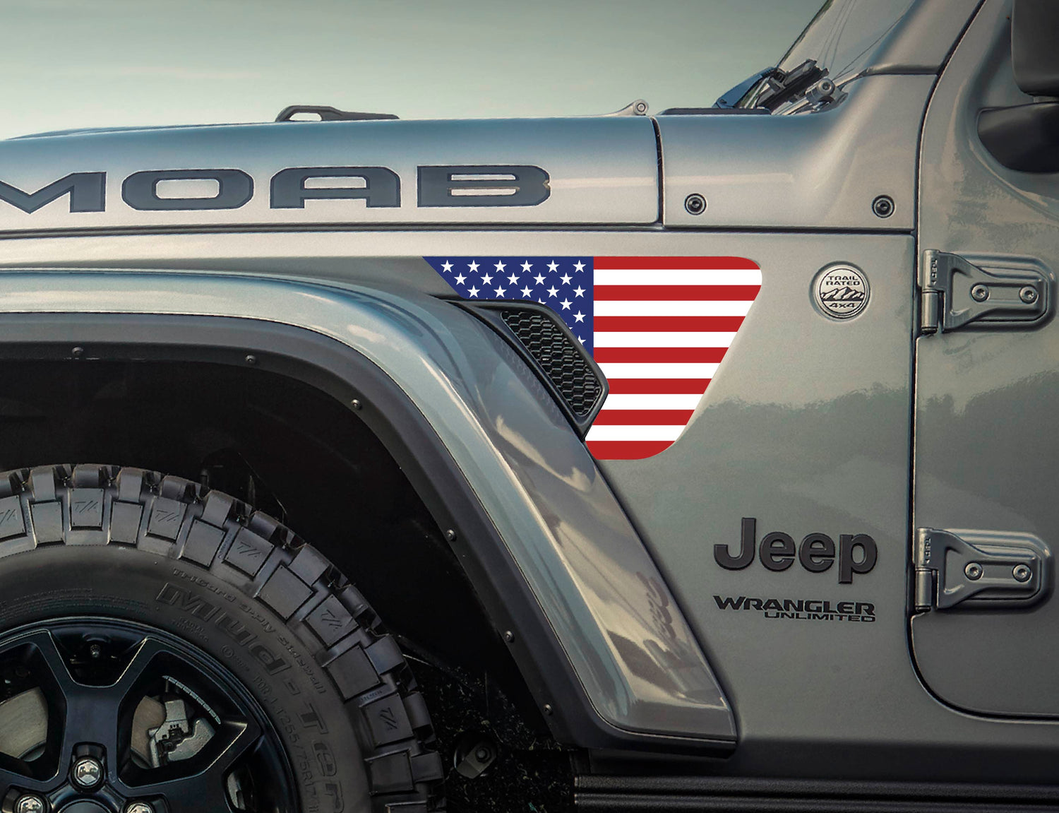 Black dark American Flag Design printed decal cut to fit inside the 2018 & newer Jeep Wrangler JL and 2020 and newer Jeep Gladiator fender vent.