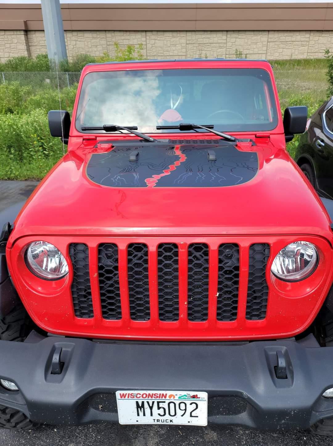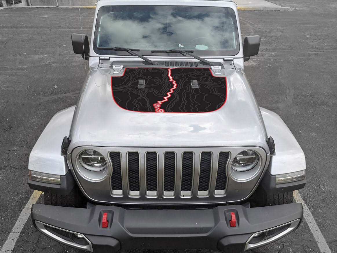 Large Blackout red line decal with Topography lines cut to fit on the 2018 & newer Jeep Wrangler JL and 2020 and newer Jeep Gladiator hood.