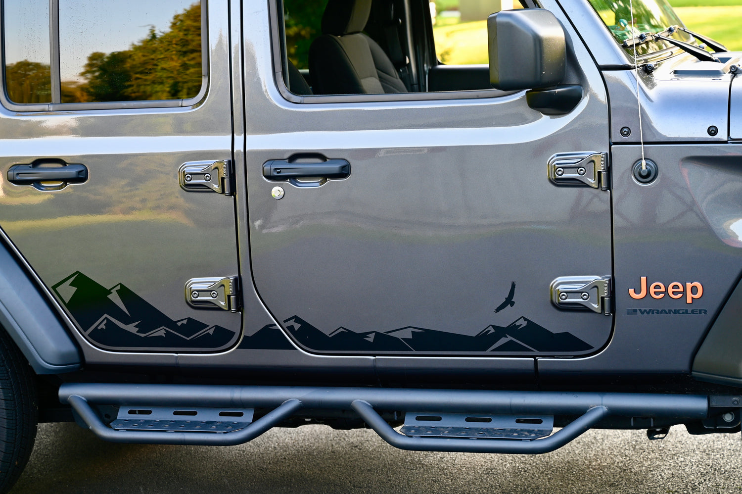 Mountain Scene vinyl decal cut to fit on the doors of the 2018 & newer Jeep Wrangler JL and 2020 and newer Jeep Gladiator.