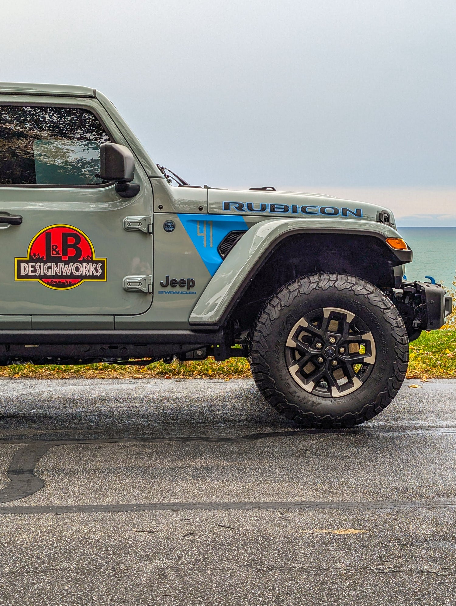 Wrangler set includes rear wheel stripe, Fender vent decal, rear door handle decal, several JP41 logos. Dinosaur footprints and door logo not included.