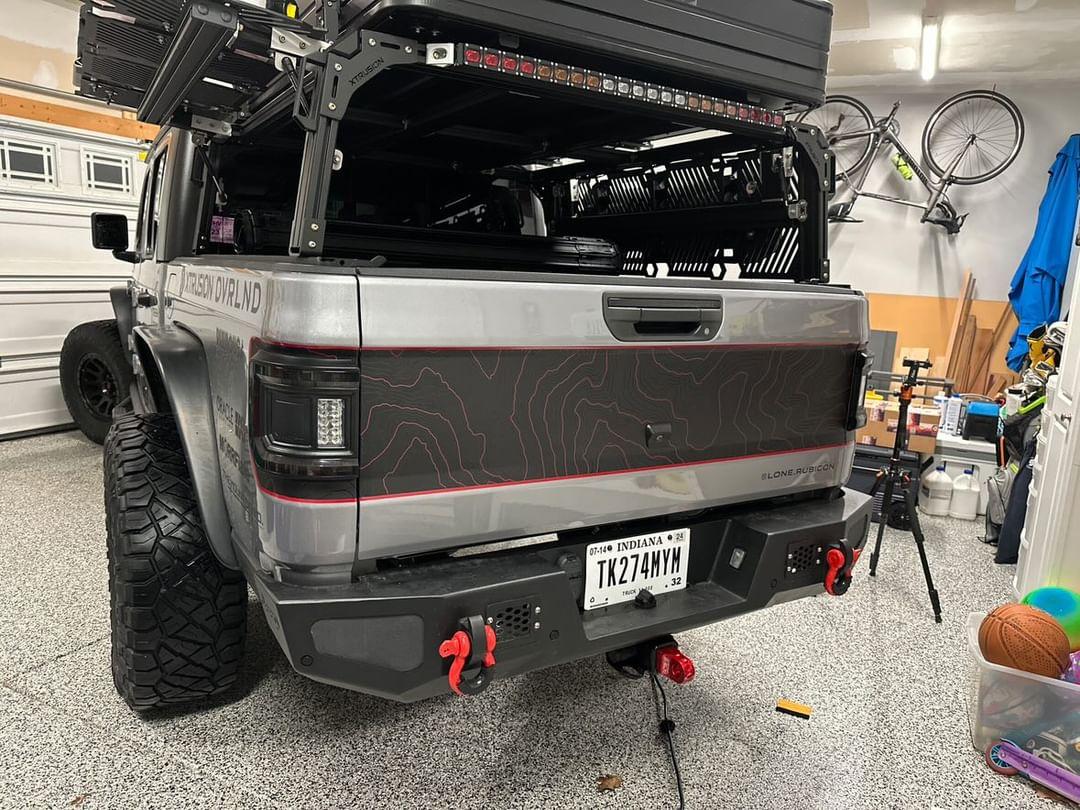Rubicon red line topographic decal cut to fit on the 2020 and newer Jeep Gladiator tailgate. Designed to be applied with removal of taillights, camera and Jeep letters.
